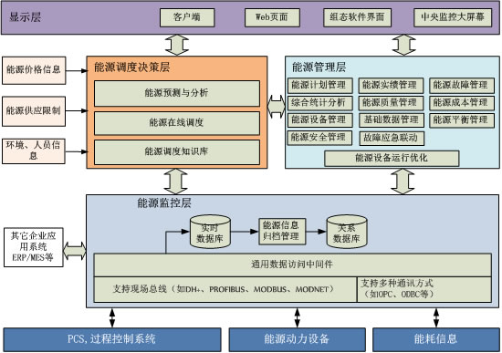 采用自動化、信息化技術和集中管理模式,對企業(yè)能源系統(tǒng)的生產、輸配和消耗環(huán)節(jié)實施集中扁平化的動態(tài)監(jiān)控和數(shù)字化管理,改進和優(yōu)化能源平衡,實現(xiàn)系統(tǒng)性節(jié)能降耗的管控一體化。