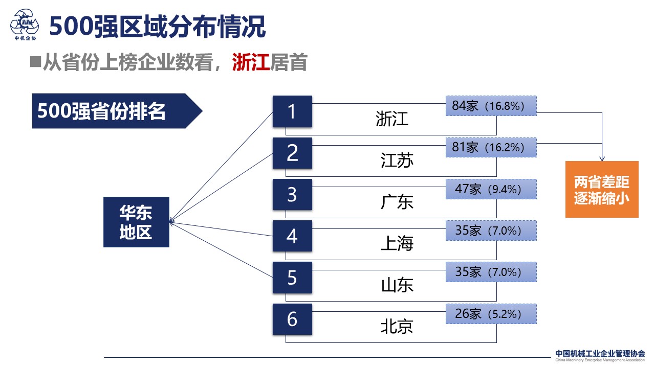 從500強(qiáng)上榜企業(yè)區(qū)域分布來看,全國(guó)有29個(gè)省份地區(qū)企業(yè)進(jìn)入榜單,浙江省、江蘇省仍然為上榜企業(yè)大省,分別有84家、81家企業(yè)入圍,同比兩省入榜企業(yè)數(shù)量差距逐漸縮小。