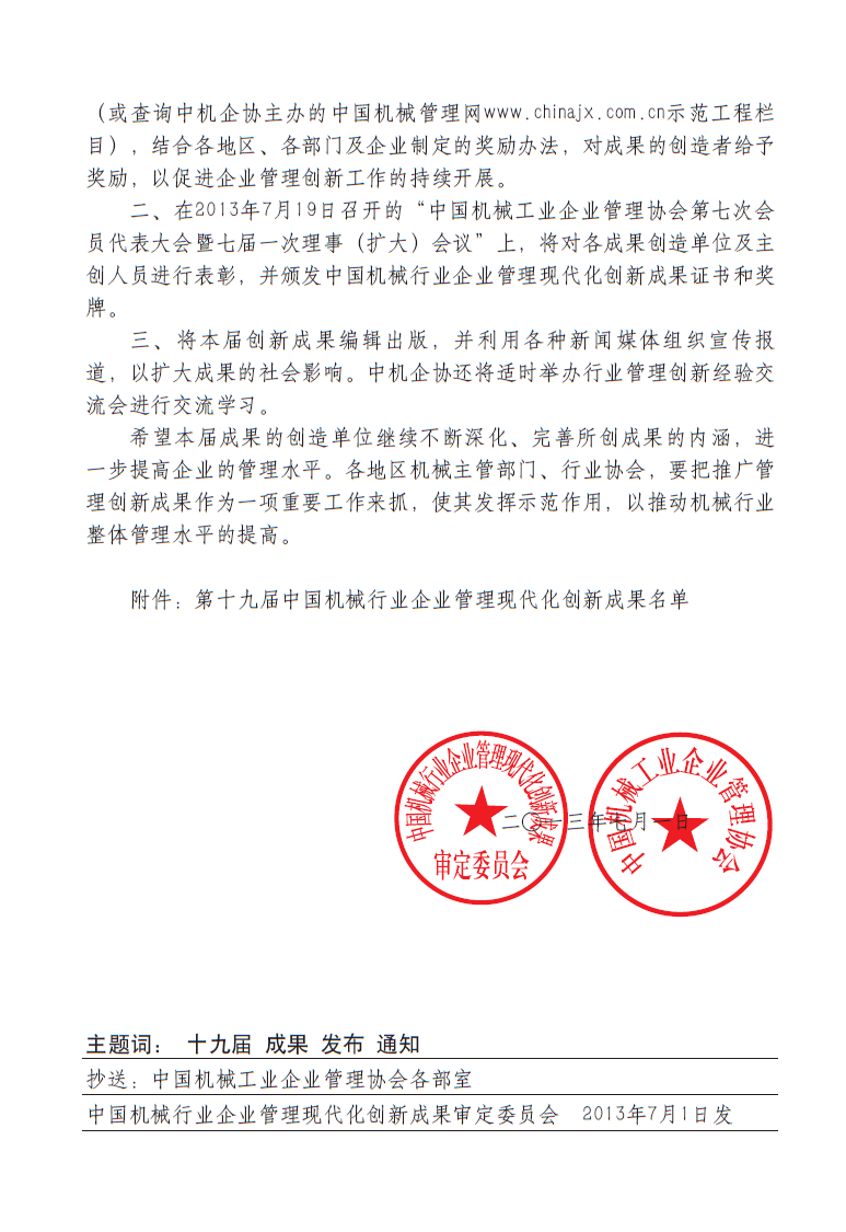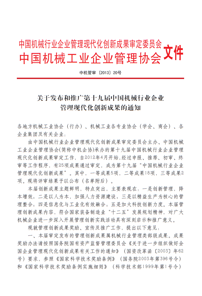 關(guān)于發(fā)布和推廣第十九屆中國機械行業(yè)企業(yè)管理現(xiàn)代化成果的通知