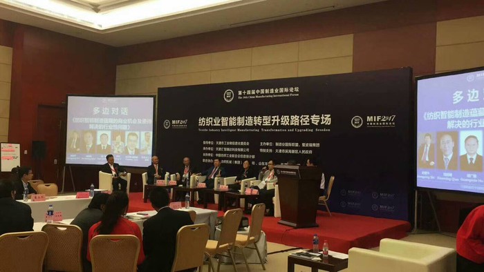 中機(jī)企協(xié)常務(wù)副理事長李玲(左5)應(yīng)邀作為嘉賓參加“紡織行業(yè)走向智能制造”平行專場對話。