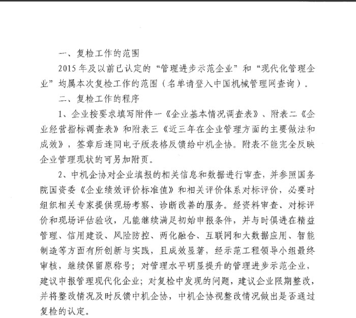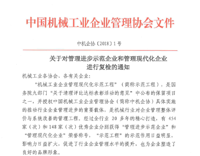 關(guān)于對(duì)管理進(jìn)步示范企業(yè)和現(xiàn)代化管理企業(yè)進(jìn)行復(fù)檢的通知