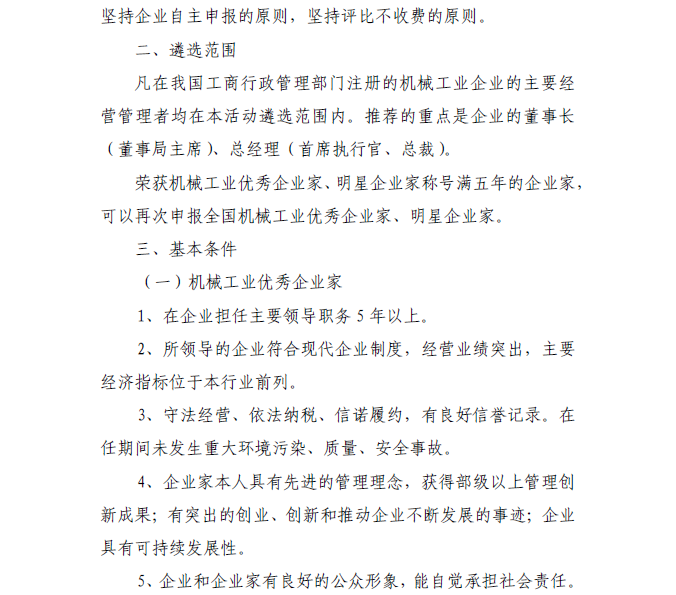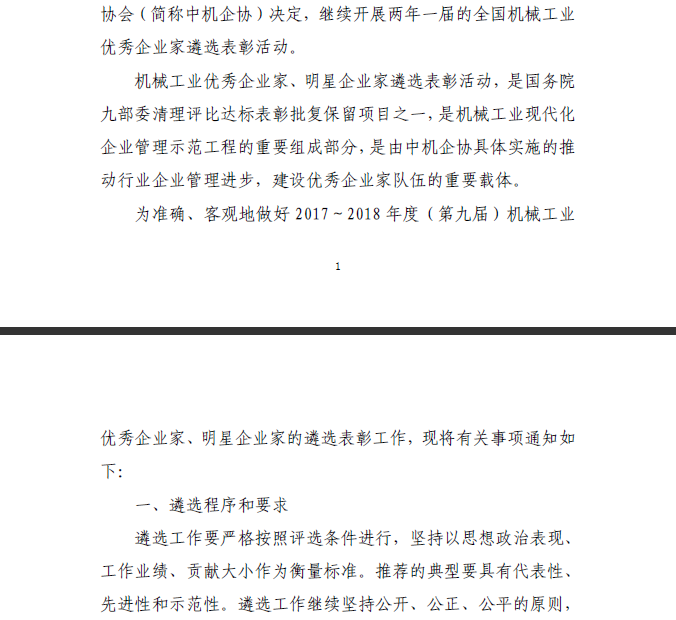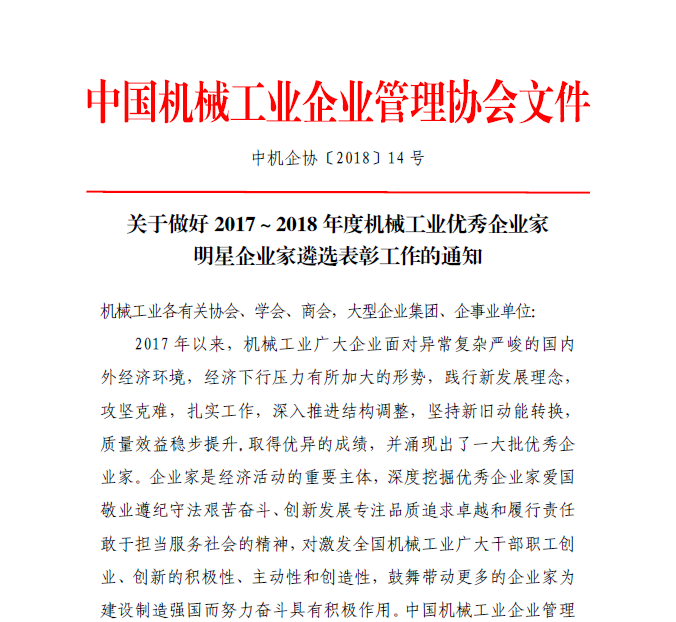 關(guān)于做好2017~2018年度機械工業(yè)優(yōu)秀企業(yè)家、明星企業(yè)家遴選表彰工作的通知