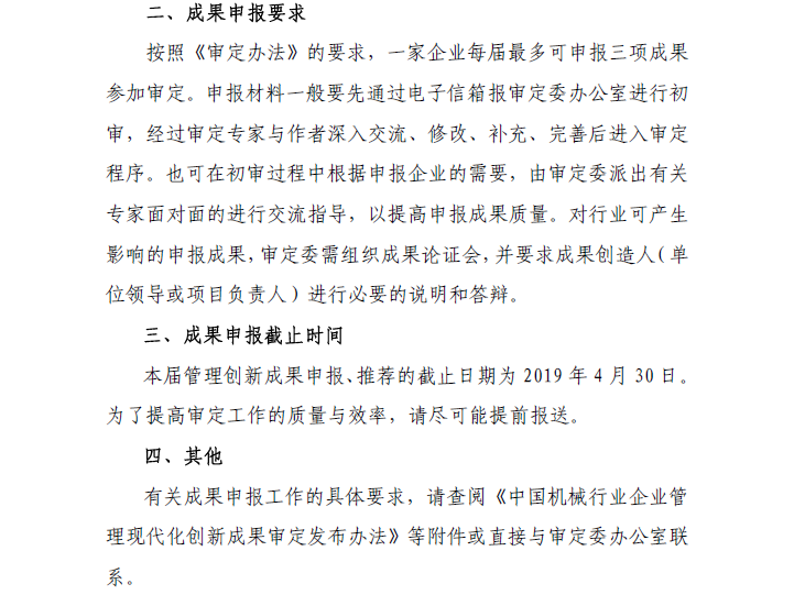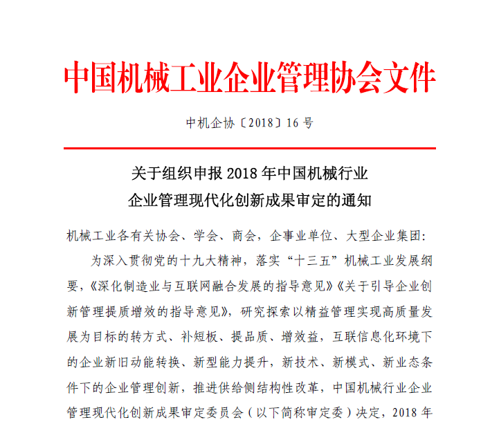 關(guān)于組織申報(bào)2018年中國機(jī)械行業(yè)企業(yè)管理現(xiàn)代化創(chuàng)新成果審定的通知