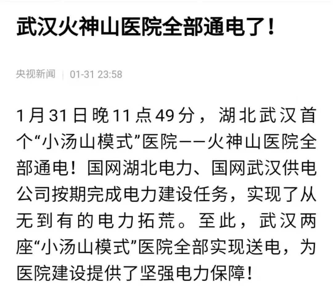 眾人拾柴,點(diǎn)亮火神山。1月31日晚11點(diǎn)49分,湖北武漢首個“小湯山模式”醫(yī)院——火神山醫(yī)院全部通電。