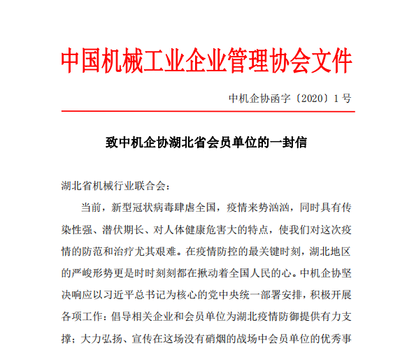 全民抗疫 同舟共濟(jì) 中機(jī)企協(xié)致信慰問湖北省會(huì)員企業(yè)